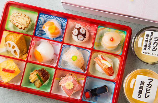 見た目にも華やかで、行楽やもてなしの場にもピッタリの手まり寿司を11貫詰め合わせたセットです。多彩な味をお楽しみいただけると同時に、軽くつまめる気軽さも魅力です。口当たりにこだわった茶わん蒸しと、ファンの多い亀吉プリンをお付けしております。